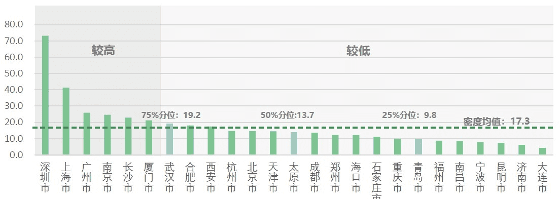 图为:25座城市公用桩密度分布(单位:台/平方公里)