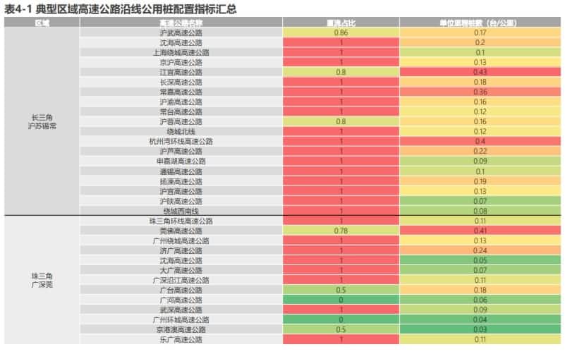 在分布密度方面,长三角沪苏锡常区域的高速公路沿线单位里程配置的公用桩数达到0.13台/公里,是珠三角广深莞区域的2倍。其中,沪苏锡常区域中的江宜高速、杭州湾环线高速单位里程桩数超过了0.4台/公里;广深莞区域仅有莞佛高速的单位里程桩数超过了该值。同时,沪苏锡常区域的沪陕高速单位里程公用桩配置密度低于0.07台/公里,广深莞区域的大广、沈海、广河等5条高速单位里程公用桩配置密度低于该值。