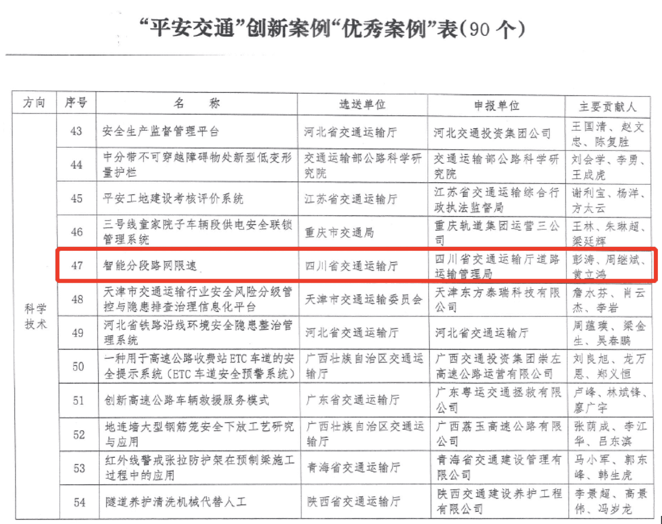 日前,交通运输部安全委员会公布2020年“平安交通”创新案例名单,全面推进交通运输安全生产领域创新发展,加速建设高水平平安交通。名单中,四川省交通运输厅道路运管局(简称四川省运管局)报送的中寰卫星“智能分段限速路网”产品入选“科学技术”方向优秀案例。