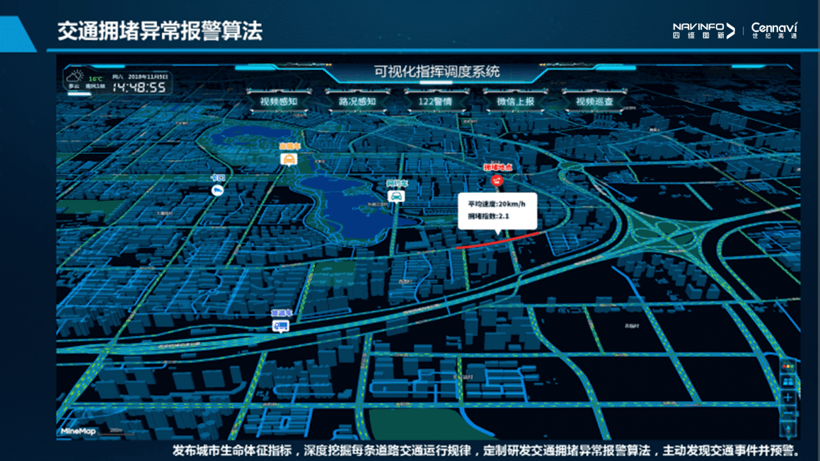 解决方案:利用交通拥堵短时预测报警定制算法,将实时车速、路段、天气、时段、特殊事件、历史数据等与平均车速相关性强的六个维度的特征数据进行预处理,建立并训练深度学习网络,实现平均车速的短时预测。根据预警算法实时监测道路交通运行情况,可提前3分钟预警拥堵路段,模型算法已经覆盖106条主干道,日均预警180起,实现了警情发现由被动接警向提前预警转变。