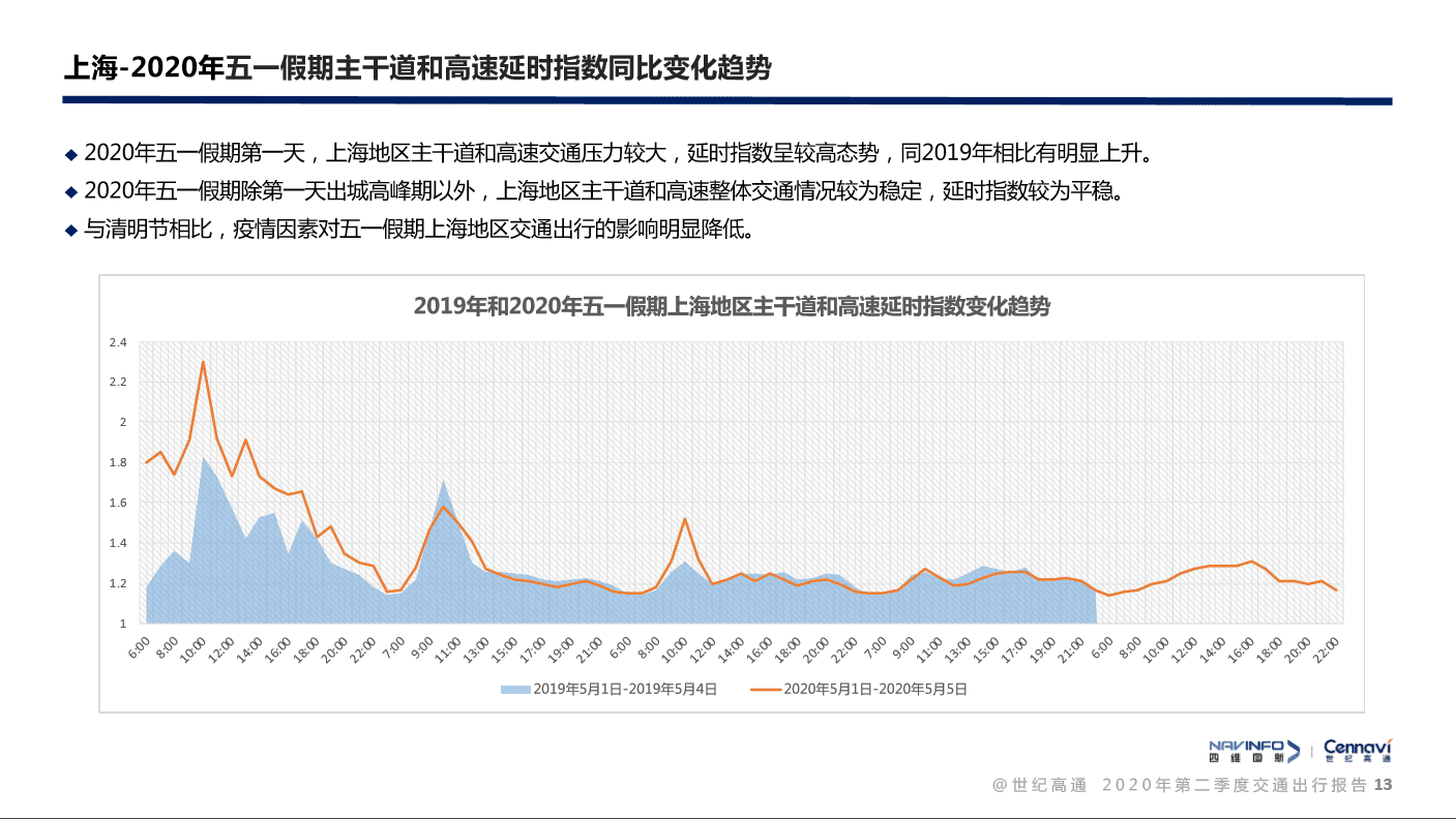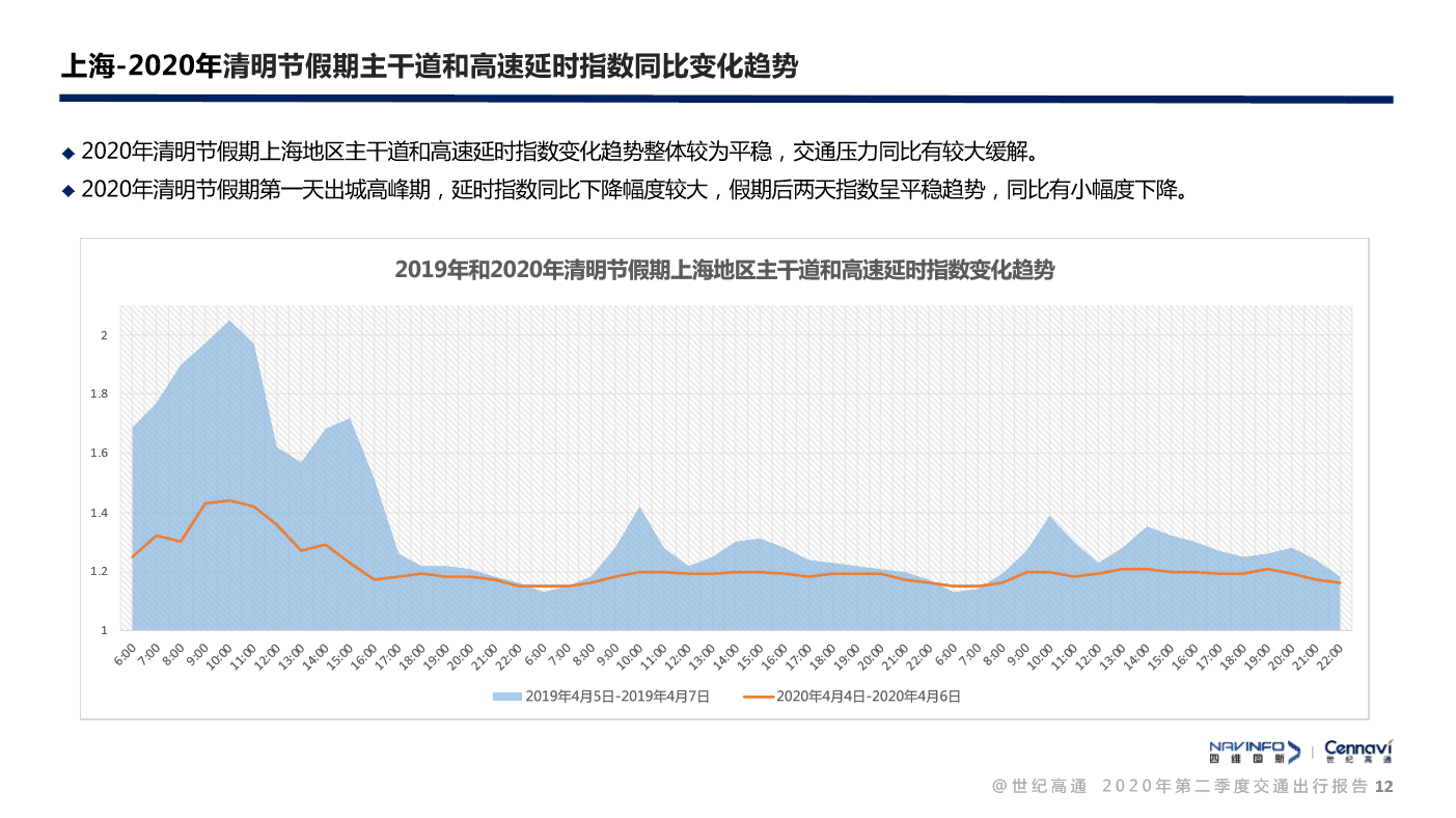 该报告除工作日高峰时段的分析之外,还就2020年清明、五一、端午等节假日期间,上海地区的主干道和高速延时指数趋势变化进行同期对比分析。