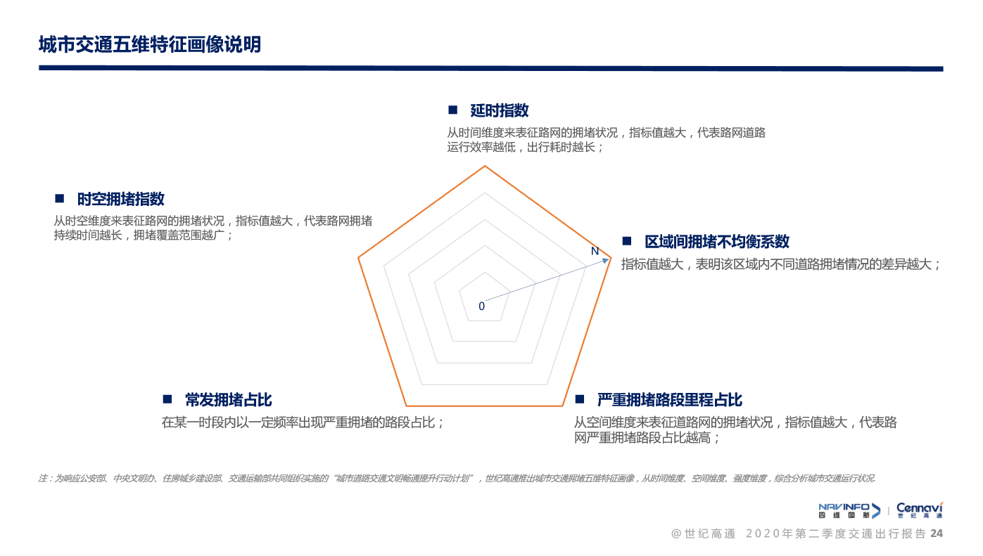 世纪高通城市交通五维特征画像是为响应公安部、中央文明办、住房城乡建设部、交通运输部共同组织实施的“城市道路交通文明畅通提升行动计划”所推出,主要包括时空拥堵指数、延时指数、区域间拥堵不均衡系数、常发拥堵占比、严重拥堵路段里程占比等指标,分别从时间维度、空间维度、时空维度出发,综合分析城市交通运行状况。