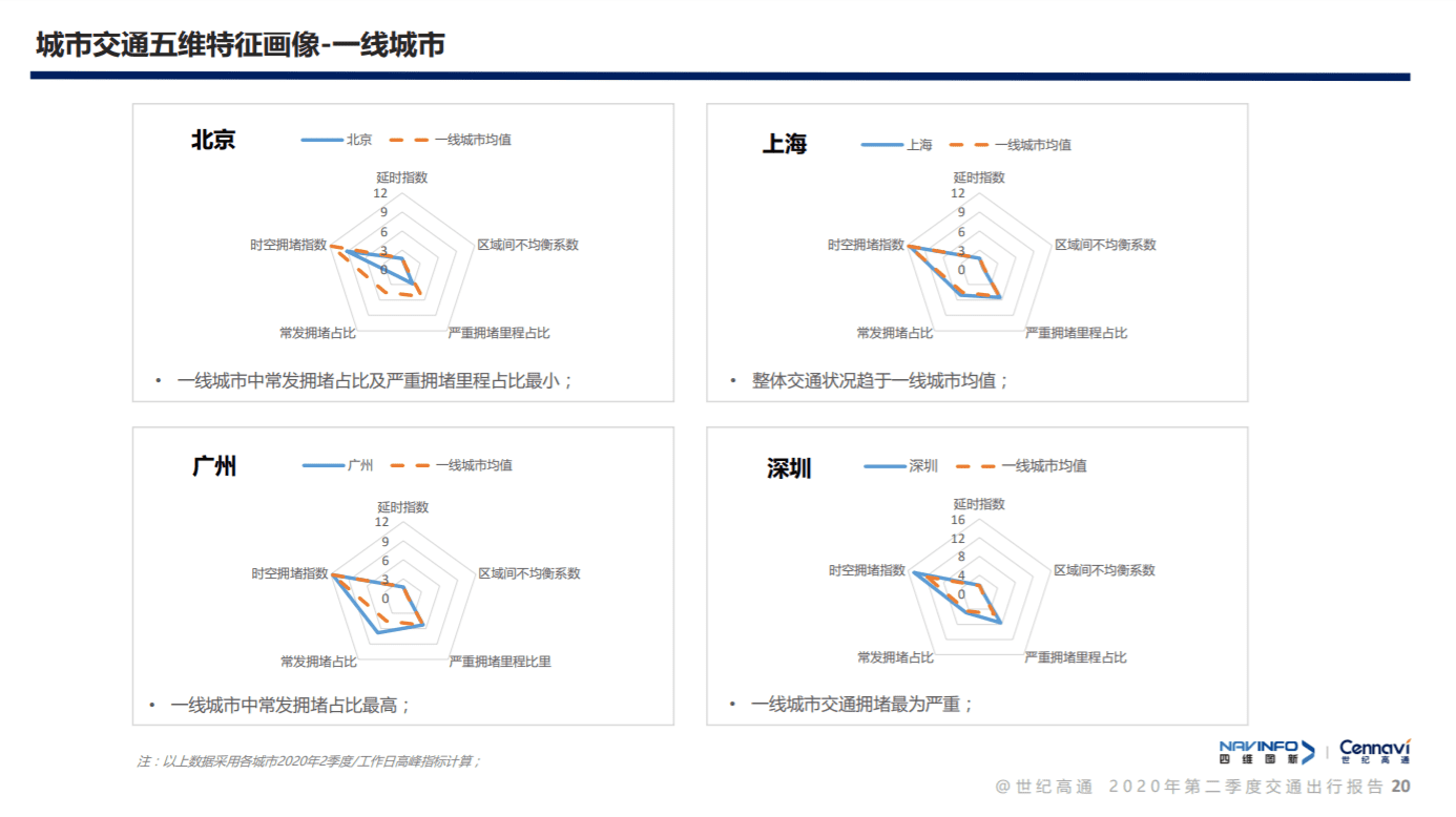 近日,四维图新旗下专业大数据公司世纪高通正式发布《2020 Q2交通出行报告》(以下简称报告)。报告显示,全国主要城市工作日高峰延时指数稳步上升,城市交通基本恢复常态。其中,深圳、重庆、广州位列全国一线及新一线城市延时指数排名前三。