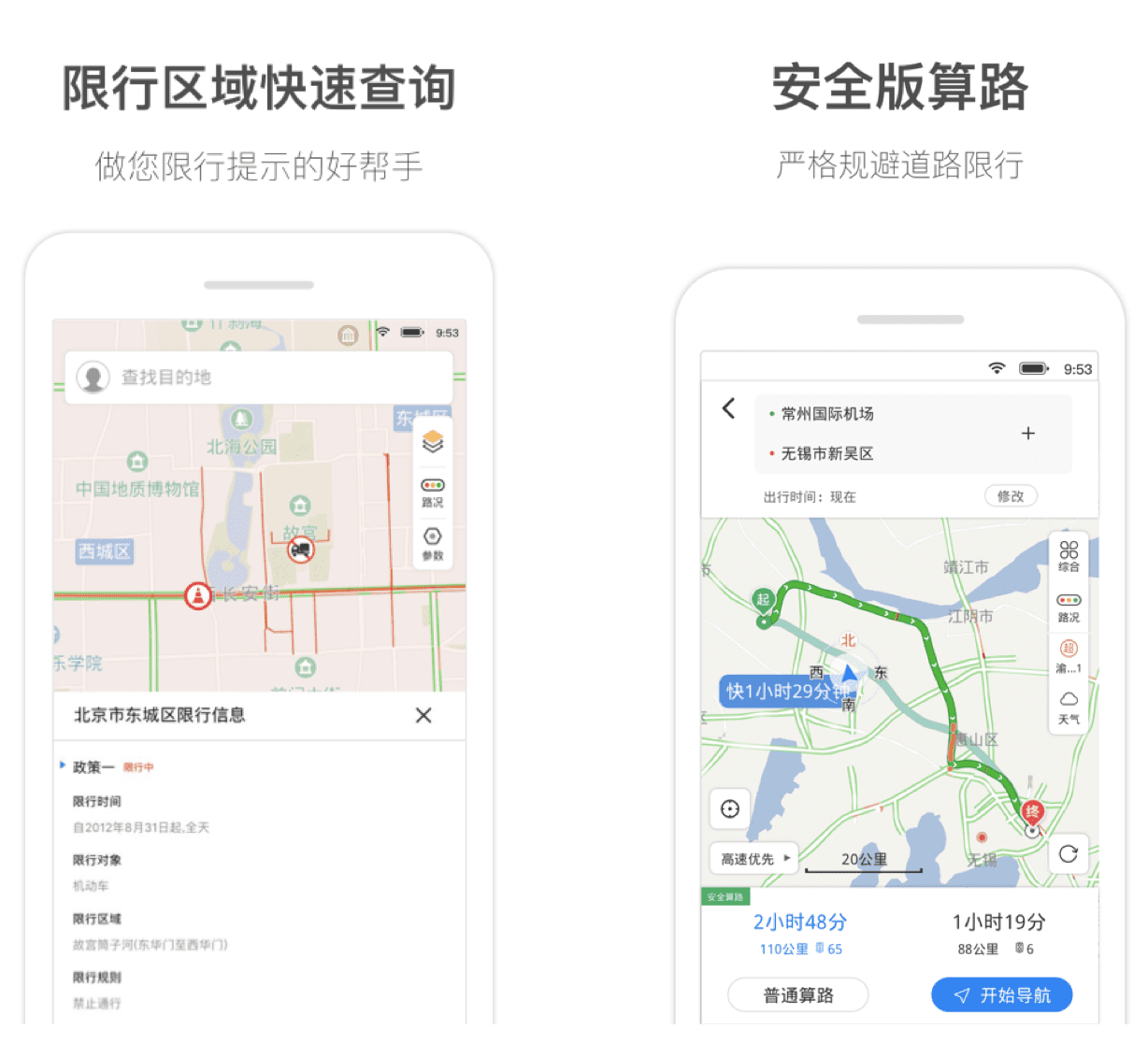 车辆在途时,将实时播报天气状况、油量预警,针对行驶过程中的各类警示信息、摄像头信息、限行信息在恰当的时机提供合理的安全提醒。其中限行信息不仅包含了限高,限宽,限重等物理限行信息,还包含了限行区域,限行时间等政策限行信息,导航在行驶的过程中对前方即将到达的限行信息位置、限行类型、限行值进行播报和提醒,让车主及时进行路线的避让。