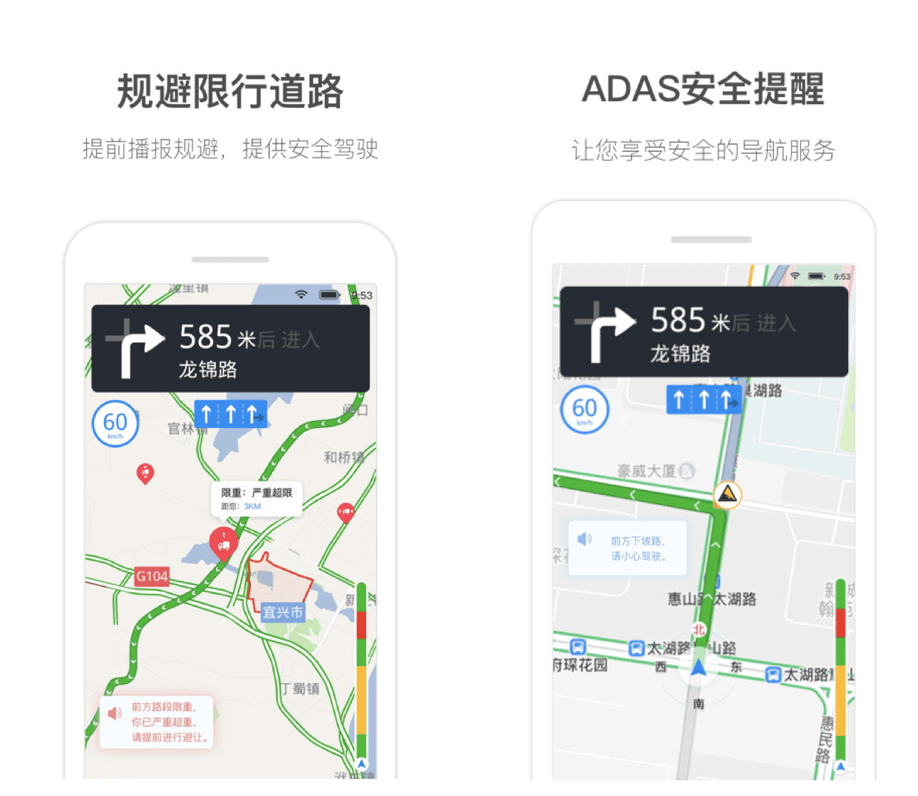 同时,在常规导航语音播报及限行信息播报基础上,增加辅助驾驶的坡度、曲率播报,基于辅助驾驶地图数据, 以节能,安全驾驶为考量,UI/语音提示用户进行速度及档位的控制。