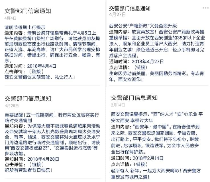 1、西安交警自媒体平台影响力位居陕西省首位。西安交警积极响应互联网+战略,自主建立了西安交警微信服务号和订阅号、西安交警APP、西安交警支付宝城市服务三大自媒体平台,通过提供各类便民服务功能引导用户注册,截至目前,共上线73项便民功能,累计关注用户380万,累计服务群众6800万人次。西安交警依托自媒体平台和云服务弹性带宽,自主研发了每小时百万级的消息推送功能,可在4小时内向近400万用户推送信息。西安交警自媒体平台的影响力、覆盖面稳居陕西省政务媒体首位。