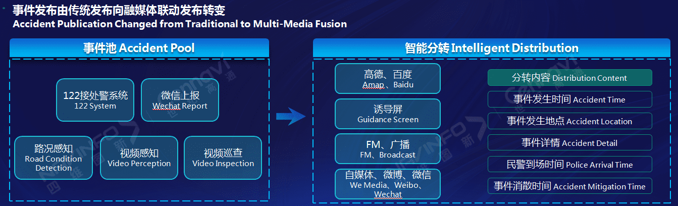 七、事件发布由传统发布向融媒体联动发布转变。西安交警融合自媒体平台、BAT地图平台、广播电台、诱导屏等宣传渠道,通过西安交警互联网+路况大数据平台,实现交通事件的一键发布,全渠道自动联动发布,全力推动事件发布由传统发布向融媒体联动发布转变。