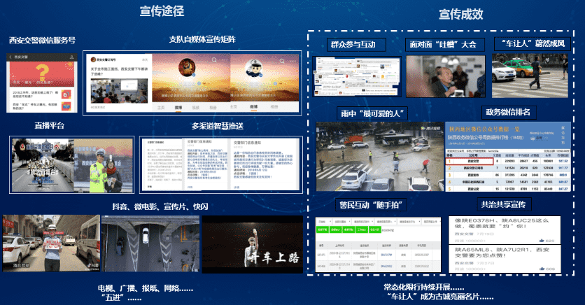 西安交警自有的涵盖了微博、微信、APP,支付宝在内的宣传媒体矩阵,通过抖音、直播、媒体报道等形式全方位宣传交通政策法规,先后与陕西电视台、陕西交通广播等多家媒体合作,引导市民利用微信上报、一键报堵等渠道参与到西安的交通管理工作中来,对交通违法、不文明行为进行曝光,对交通正能量进行宣扬。目前,微信随手拍周上报达4000多例,总量接近40万,在全社会形成共治共建的良好交通氛围。此外,西安交警也利用自媒体,及时发布假日、恶劣天气的交通预判报告,指导市民出行。