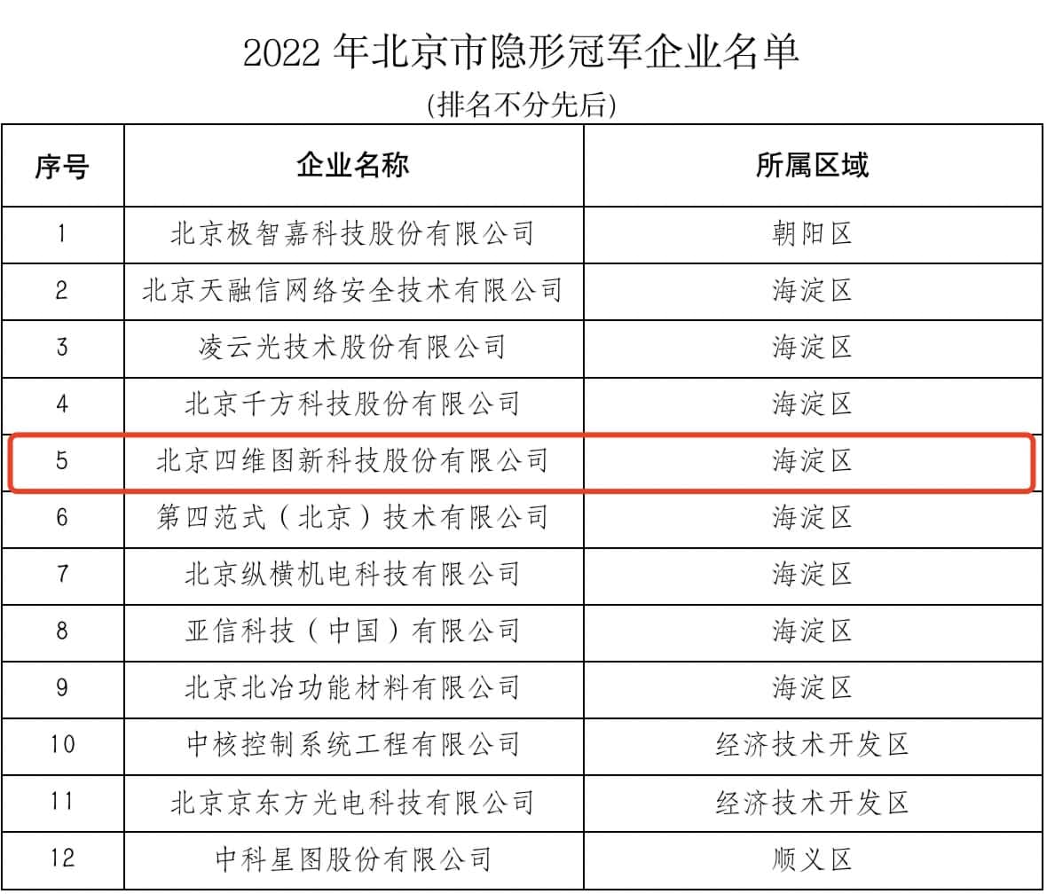 近期,北京市经济和信息化局会同市工商联组织开展了“2022年北京市隐形冠军企业”的征集和认定工作,四维图新通过严格评审与选拔,入选榜单。
