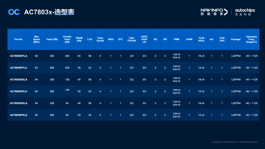 此外,AC7803x系列芯片与杰发科技已量产的MCU芯片AC7801x和AC7840x同封装可实现硬件兼容,AC7803x 48Pin硬件可向下兼容AC7801x 48Pin,AC7840x 64Pin硬件可向下兼容AC7803x 64Pin,便于客户平台化选型,可简化客户开发流程以降低开发成本,提高开发效率。