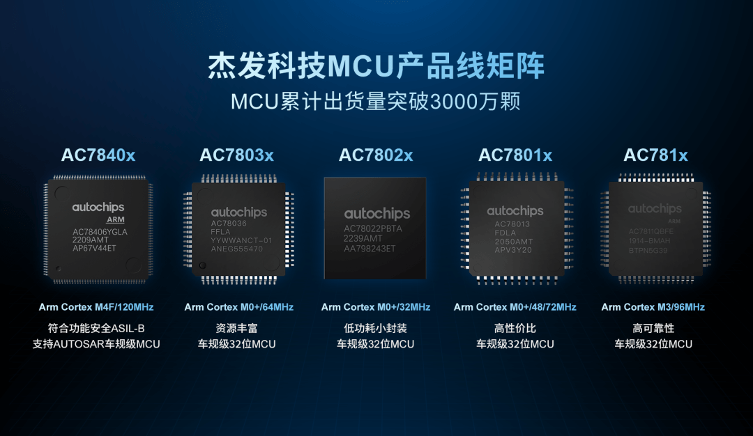 此次正式推出的AC7803x,是公司自2018年推出第一颗国产车规MCU以来迭代的第5代MCU产品,完善了杰发科技在MCU产品线的布局。杰发科技作为该领域的领航者,已形成汽车MCU的全覆盖,可为客户提供更加丰富的料号选择,包括基于M0+和M3内核的AC780x系列和AC781x系列,基于M4F内核的AC7840x系列,以及未来多核域控制器AC787x系列。