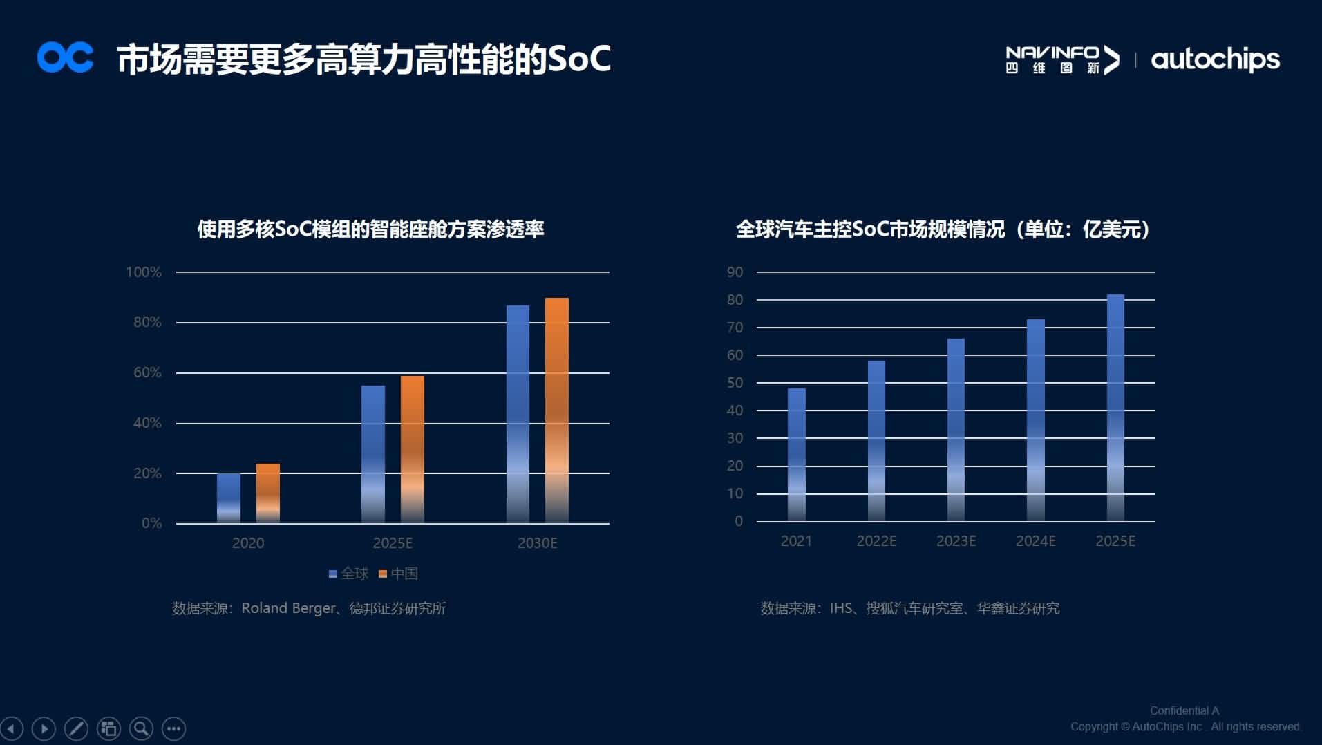 在演讲中,马伟华从汽车电动化智能化浪潮引领车规SoC和MCU变革谈起,汽车EE架构变革将导致市场需要更多高算力高性能的自动驾驶SoC和智能座舱SoC。据IHS Markit预计,2024年座舱NPU算力需求将是2021年的10倍,CPU算力需求是2021年的3.5倍。全球使用多核SoC模组的智能座舱方案渗透率将在2025年接近60%,2030年超过80%,全球汽车主控SoC市场规模也将在2025年突破80亿美元。由此背景下带给国产汽车芯片厂商在SoC这条道路上将有更长的路要走,更多的事情要做。