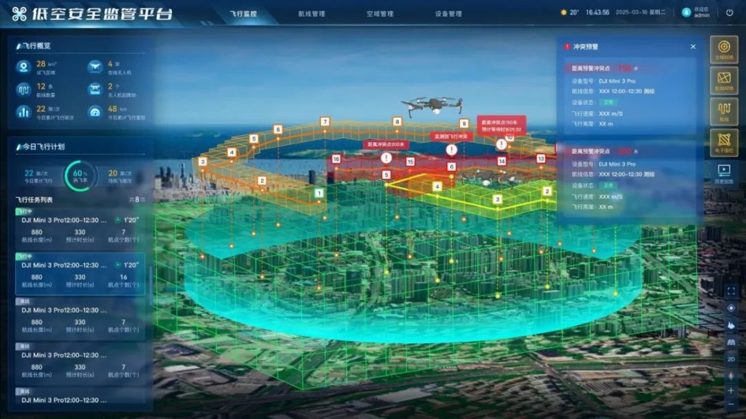 对智能交通管理部门来说,数字孪生底座更是刚需。 例如,随着无人机等低空飞行器数量激增,飞行呈现“多类型、高频次、高密度” 特点,低空安全监管需同时具备检测预警、空间计算、航线规划等功能。而借助实景三维数据和模型,管理部门可提前模拟飞行路径,避开障碍物、优化效率,大幅降低空中交通冲突风险。