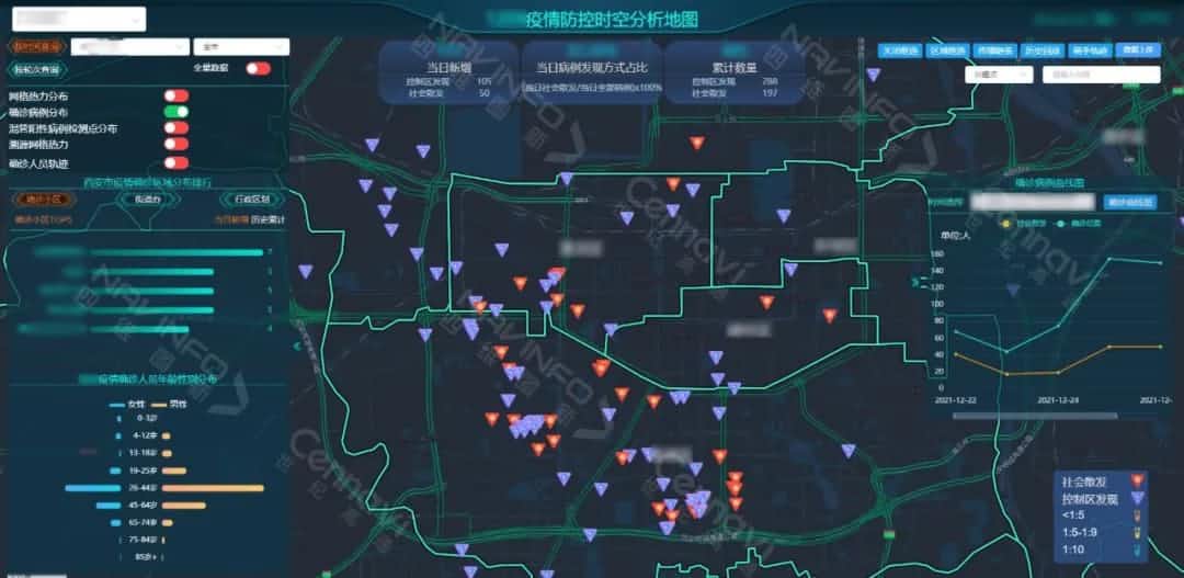 疫情时空分析平台 “疫情看板”功能,集成多个资讯传达、数据统计工具,形成包罗多种疫情信息的综合门户,广泛应用于政府、防疫部门等指挥调度场景。“疫情看板”功能通过数据可视化,快速了解以确诊病例为核心的防控圈层,及新增确诊、累计确诊、发现方式、区域排名、确诊年龄分布等多维数据信息,全方位掌握疫情发展形势,并通过确诊曲线了解发展趋势,辅助防疫指挥部快速响应突发病情。