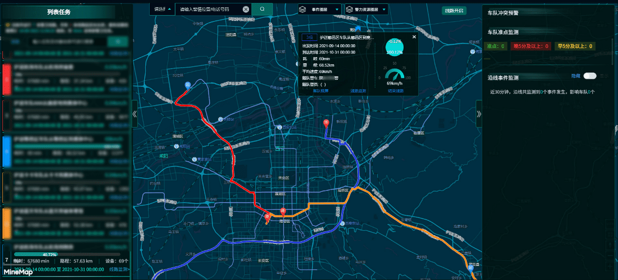 就大型活动安保,世纪高通针对警卫路线方面的问题研发了警卫安保系统,通过北斗+GPS双模定位设备实现对十四运赛事保障车辆的实时定位,对路径规划创建的所有任务路线的运行情况进行监测,提供多车队联动及智能指挥调度,保证车队运行有序、抵达时间精准、应急处置高效,针对单路线还可实时查看车前车后视频和沿线监控。同时,世纪高通结合道路路面信息、实时路况和其他情报信息,制定最优安全警卫保障方案,为交通警卫安保和赛事活动车队路线保障提供了强有力支撑。
