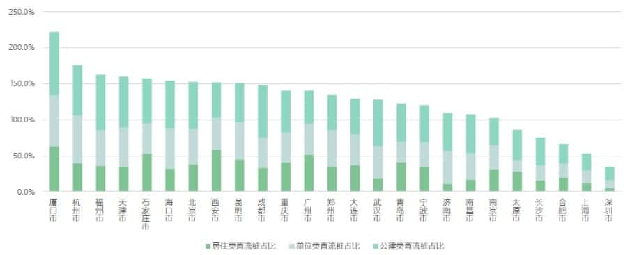 随着居民对直流快充服务诉求的提高,公用桩的供给结构开始向直流快充桩方向侧重。25座城市中心城区的直流公用桩占比均值接近50%,15座城市的直流公用桩占比超过50%。