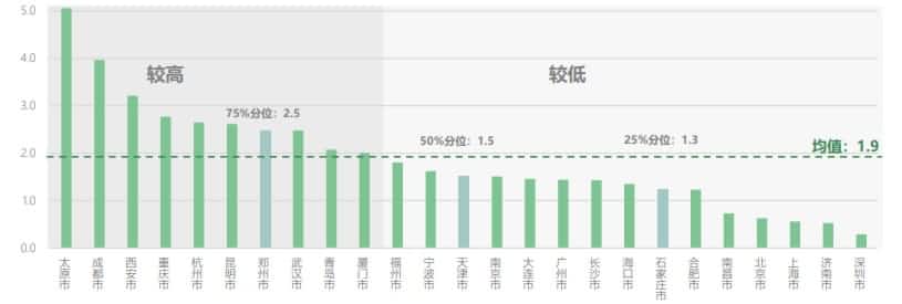 图为:25座城市公用桩密度分布(单位:台/平方公里)