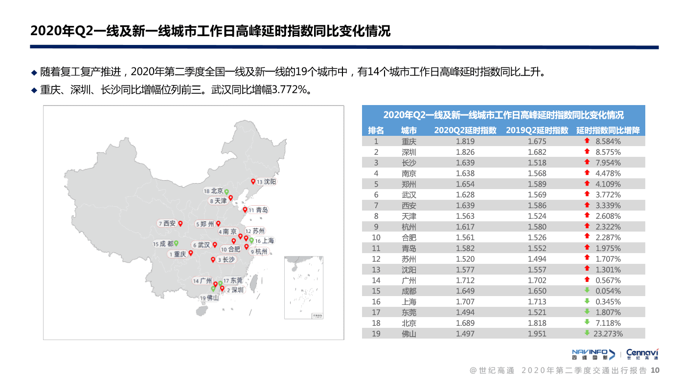 报告显示, 2020年第二季度全国一线及新一线工作日高峰延时指数同比稳步提升。其中,在全国一线及新一线的19个城市中,有14个城市工作日高峰延时指数同比上升; 重庆、深圳、长沙同比增幅位列前三,武汉同比增幅3.772%。表明随着复工复产的有序推进、公众出行度持续提高,城市交通拥堵⽔平在逐步回升,城市交通已逐步恢复常态,疫情影响力逐渐降低。