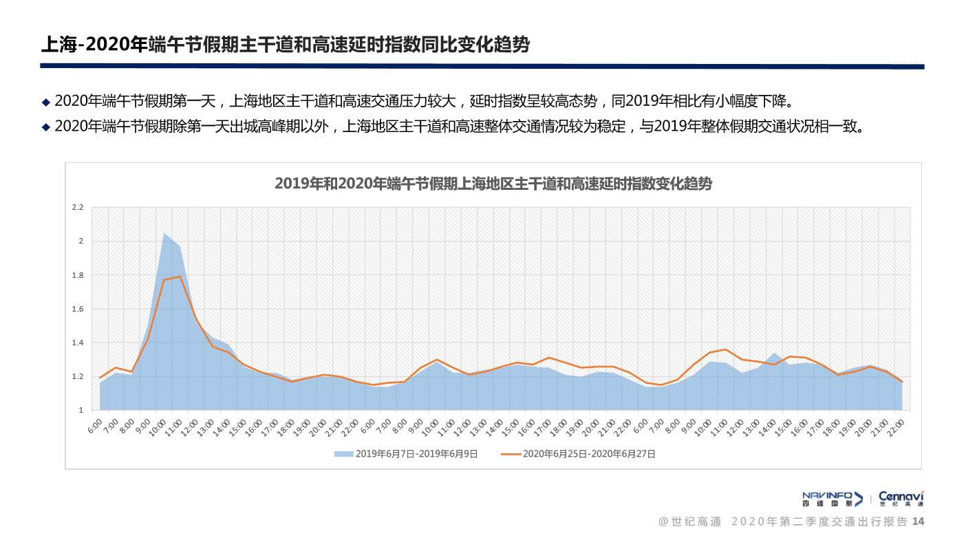 该报告除工作日高峰时段的分析之外,还就2020年清明、五一、端午等节假日期间,上海地区的主干道和高速延时指数趋势变化进行同期对比分析。