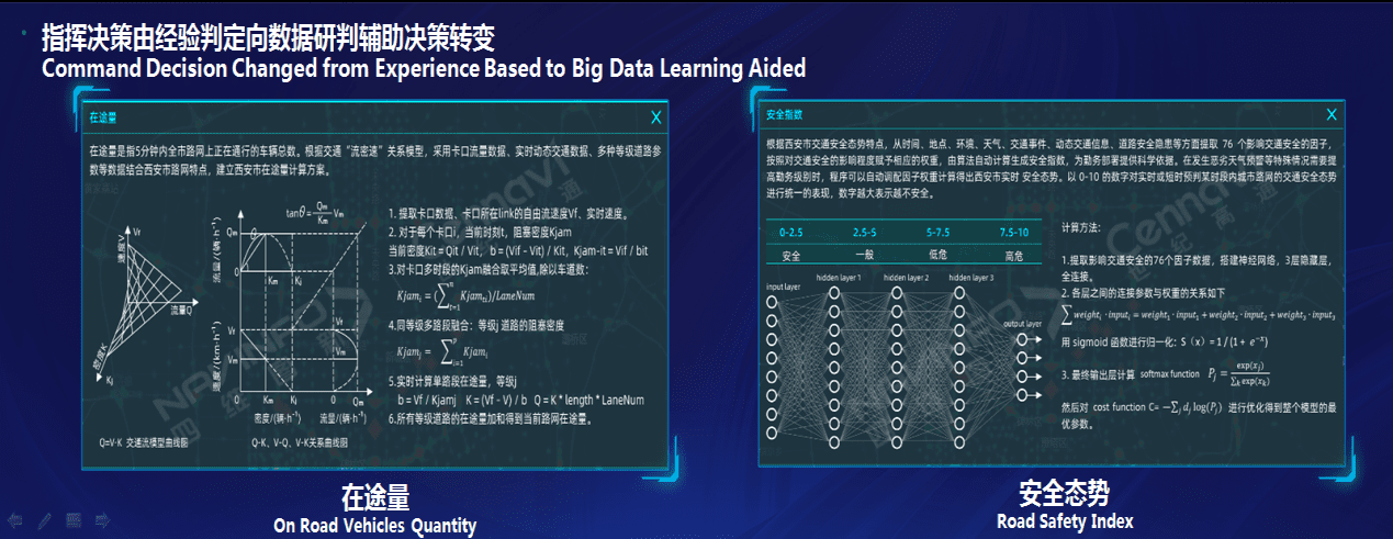 一、指挥决策由经验判定向数据研判辅助决策转变。借由世纪高通公司大数据能力及算法模型,西安交警创新发布城市交通生命体征,实时反映交通健康状况,运用城市交通生命体理论,基于大数据平台实时计算能力,提出了西安市城市交通运行七大生命体征,即在途量、安全态势、延迟指数、市区行驶均速、拥堵里程、市区拥堵指数、警力覆盖率。每五分钟对各个指标进行计算和更新,并与历史同期数据进行多维度对比,为西安交警城市大脑指挥中心提供数据支撑。