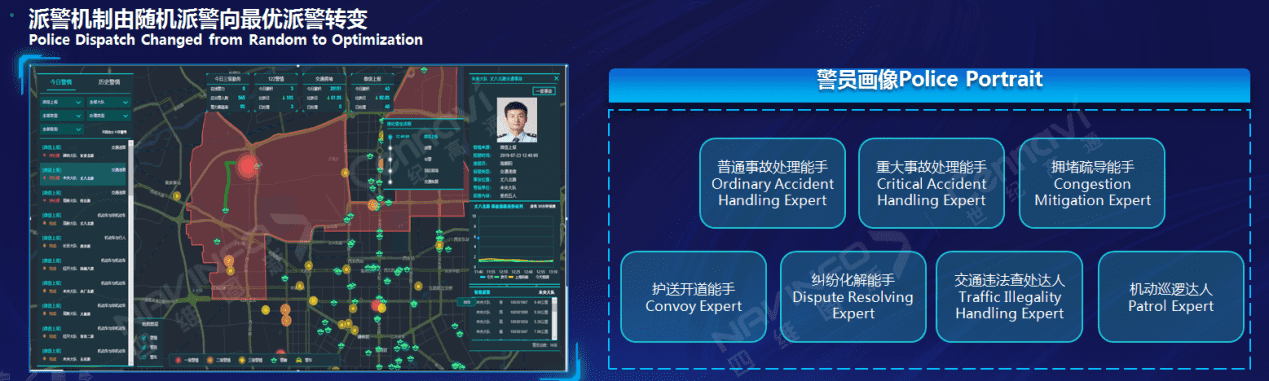 四、派警机制由随机派警向最优派警转变。西安交警依托海量数据优势,运用大数据画像技术为民警绘制警员画像,例如:普通事故处理能手、重大事故处理能手、拥堵疏导能手、护送开道能手、纠纷化解能手、交通违法查处达人、机动巡逻达人等,并将警员画像应用于派警机制,西安交警“城市大脑”指挥中心根据警员画像、警力分布、事件位置、警员状态等多个维度,设计最优派警算法模型,自动计算生成最优派警推荐,规划最优出警路线,全力推动派警机制由随机派警向最优派警转变。