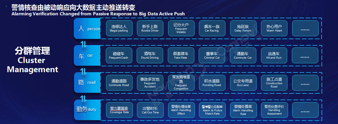 依托海量数据,对驾驶人、机动车、道路进行多维度数据刻画和打标签,制定主题鲜明的主题分群,例如:驾驶人主题:违停达人、新手上路、买卖分族、飙车一族、晒娃达人、文明达人、醉猫一族等;机动车主题:酒驾车、毒驾车、碰碰车、夜行车、通勤车、网约车等;道路主题:进出城路、进山路、上班路、旅游路、就医路、购物路。