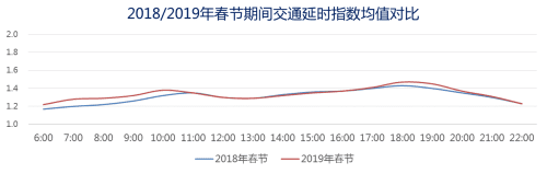 对比西安2018 / 2019两年春节期间的交通状况发现,2019年全天延时指数均值增长1.93%;考虑到游客人次大幅增加,以及雨雪天气增加等不利因素影响,西安春节期间延时指数增长处于可接受范围内。