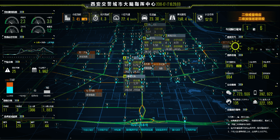 西安交警城市大脑指挥中心可视一体化指挥大屏,可实现对西安市交通全要素概览,包括城市道路通行状况、各类交通事件、全市警力分布、路网分布、重点道路区域等信息实时综合呈现。现已实现一屏全域感知、一屏综合监测、一屏统筹决策、一屏科学评价、一屏多部门协作。通过交通指数、延时指数、市区均速、在途量、拥堵里程、交通安全态势、警力覆盖率等动态与静态相结合的交通运行状况评估指标,把脉古都交通,实时反应交通健康状况。