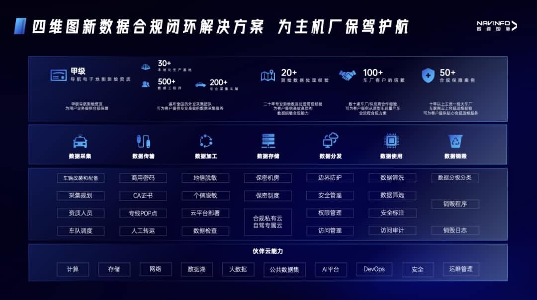 背靠二十年专业数据处理、管理经验,四维图新依托优质资质、全国范围的高效数据采集能力、数据脱敏合规技术积累,已经与数十家车厂、供应商合作,提供从原型车到量产车全流程合规方案,覆盖客户数据采集、数据传输、数据加工、数据存储、数据分发、数据使用、数据销毁的全生命周期。