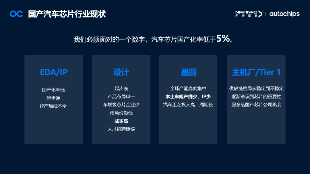 报告提到一个严峻的数字:中国汽车芯片国产化率不足5%,从上游的EDA/IP服务商、设计厂商,到晶圆制造,再到下游的主机厂和TIER 1应用,每个环节都存在着一些问题。我们必须深刻认识到自身的问题,才能找出对应的决策。