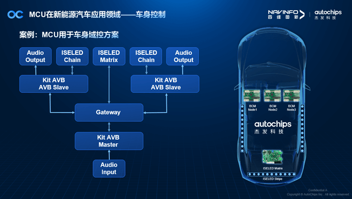 王璐在现场分享了MCU芯片的车身控制方案、自动驾驶方案和动力底盘控制方案,其中深度解读了杰发科技MCU芯片打造的车身控制方案。用一个网关芯片、两个AVB Slave和一个Master MCU芯片,成功实现了包括Audio和ISELED等各方面的控制,目前已在多款车型上量产。