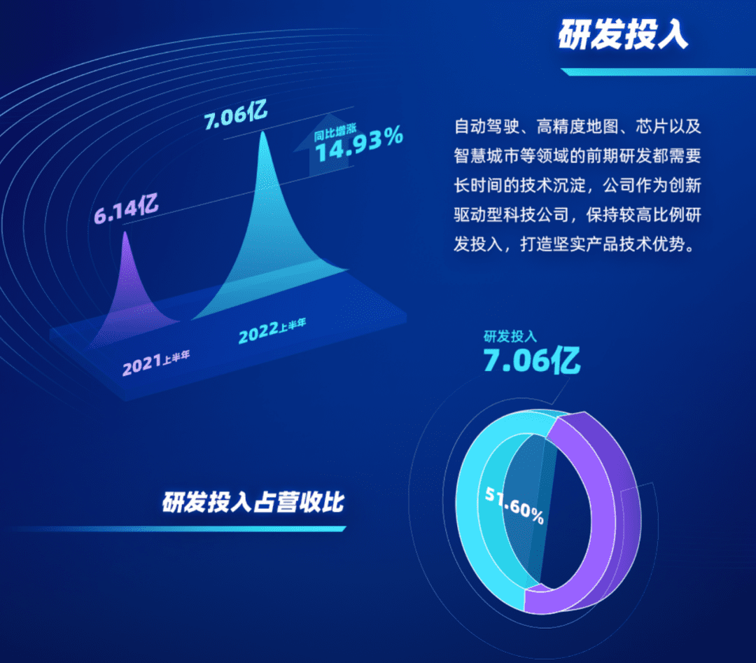 面对日益激烈的全球化市场竞争,四维图新作为创新驱动型科技公司,为推进未来发展战略,在自动驾驶整体解决方案、高精度地图、高精度定位、芯片、智慧城市等相关领域继续保持较高投入力度。2022年上半年,四维图新研发投入7.06亿元,同比增加14.93%,占营收比达到51.6%。
