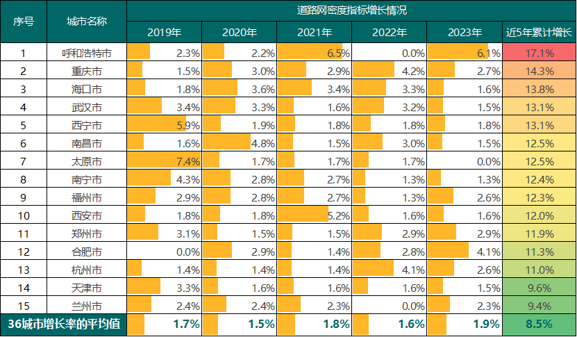武汉、西宁、南昌、太原等城市近五年累计增长超过12%。武汉累计增长13.1%,密度指标从6.0km/km2提升至6.6km/km2;西宁累计增长13.1%,密度指标从5.4km/km2提升至5.8km/km2。此外,南昌、太原近五年累计增长12.5%,南宁、福州、西安等近五年累计增长分别为12.4%、12.3%、12.0%。