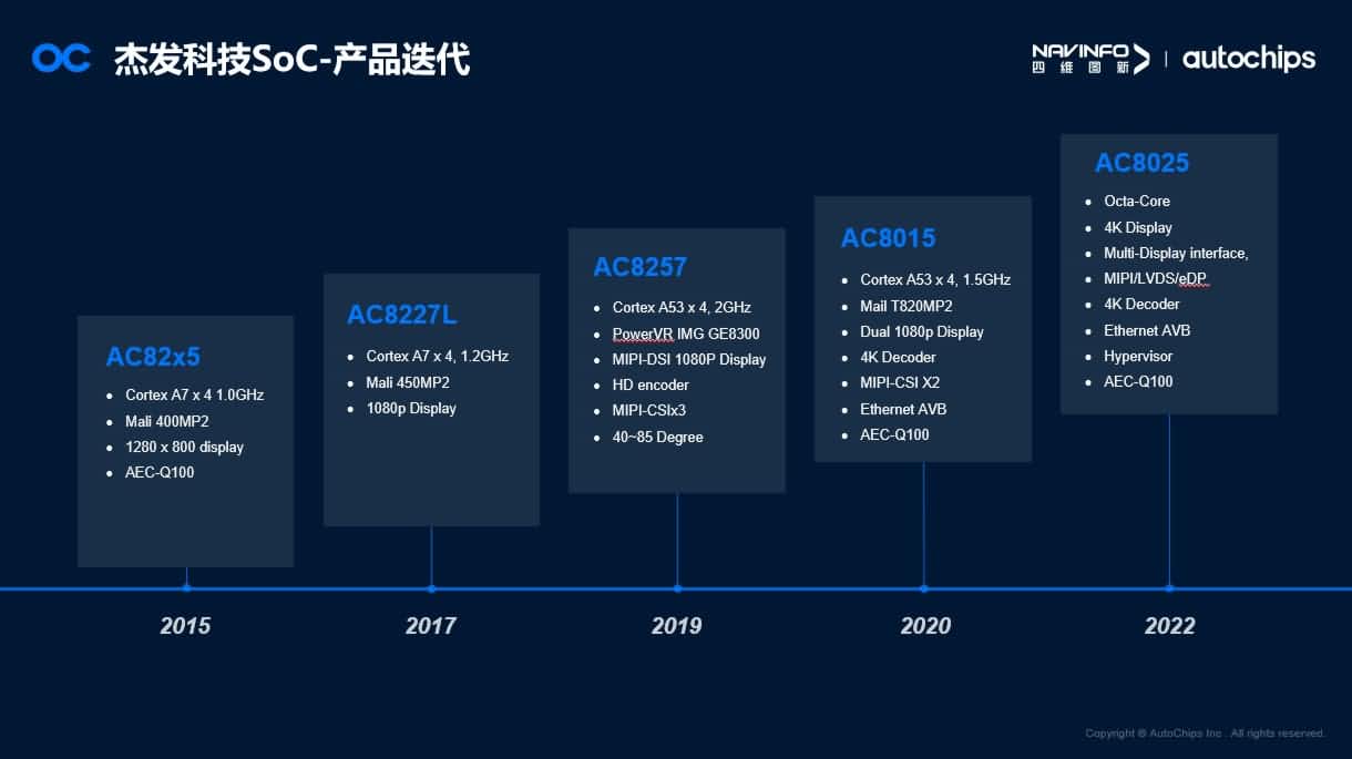 赵林祥在演讲中提到,杰发科技在智能座舱领域早有布局,SoC芯片产品至今已迭代5代,从覆盖前后装的车载信息娱乐系统SoC,车联网SoC,到2021年量产首颗智能座舱芯片AC8015,今年下半年杰发科技即将推出新一代中高阶智能座舱域控芯片AC8025。