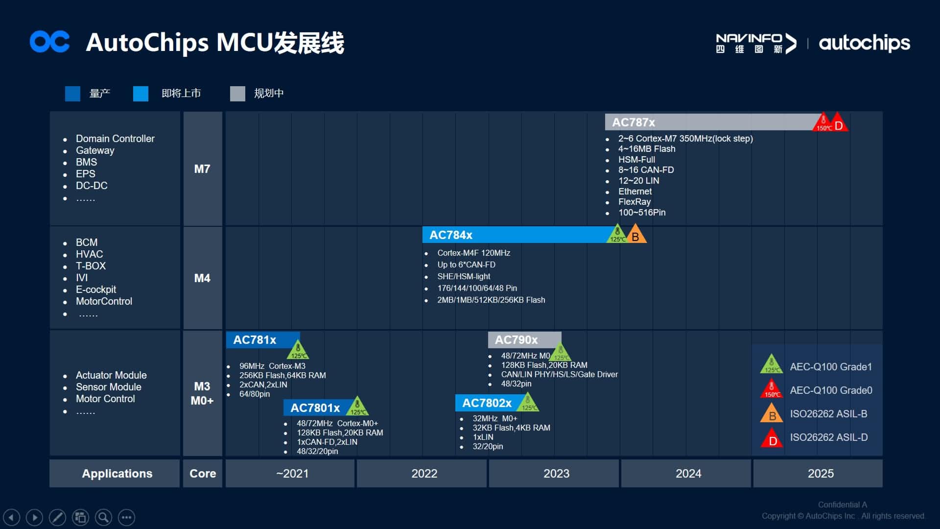 马伟华还在现场分享了AutoChips首颗满足功能安全要求的MCU AC7840x,AC7840x系列是AutoChips首款基于ARM Cortex-M4F 内核的车规级MCU,符合ISO 26262功能安全ASIL-B,支持AUTOSAR 4.4,提供MCAL及配置工具,并且拥有更大的Flash与更多的引脚。AC7840x的应用将更加广泛,尤其突破了对安全性、可靠性要求更高的底盘域和动力域应用。目前,AC7840x已经陆续送样,其中有客户已进入产品验证阶段。