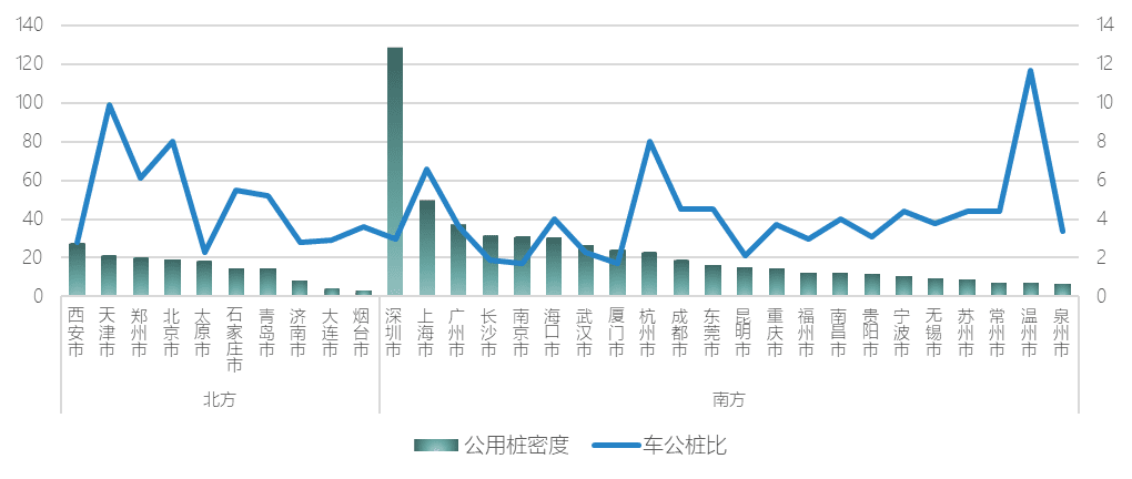 32座城市公用桩的平均密度超过21台/平方公里,其中深圳、上海、广州、长沙、南京和海口等城市的公用桩密度超过30台/平方公里。南方城市的平均公用桩密度为24.3台/平方公里,高于北方城市的15.2台/平方公里。同时,南方城市私人乘用车辆的平均车公桩比为4.1,低于北方城市的4.9。公用桩密度排名前6位、车公桩比排名前5位的均是南方城市。