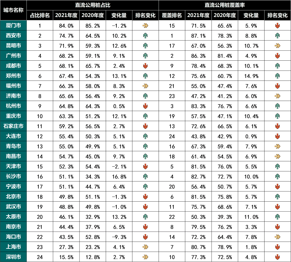 在32座城市的所有公桩中,直流公用桩占比均值约为57.3%,其中,23座城市的直流公用桩占比超过50%,直流快充服务在多数城市中心城区的公用桩中已经占到主体。与所有公桩相比,24座城市的直流公用桩覆盖率平均增长约7.1%,其中23座城市的直流公用桩覆盖率增幅高于公用桩整体覆盖率增幅,郑州、太原、昆明、重庆、成都、长沙等城市直流公用桩覆盖率较2020年度增加超过10%。