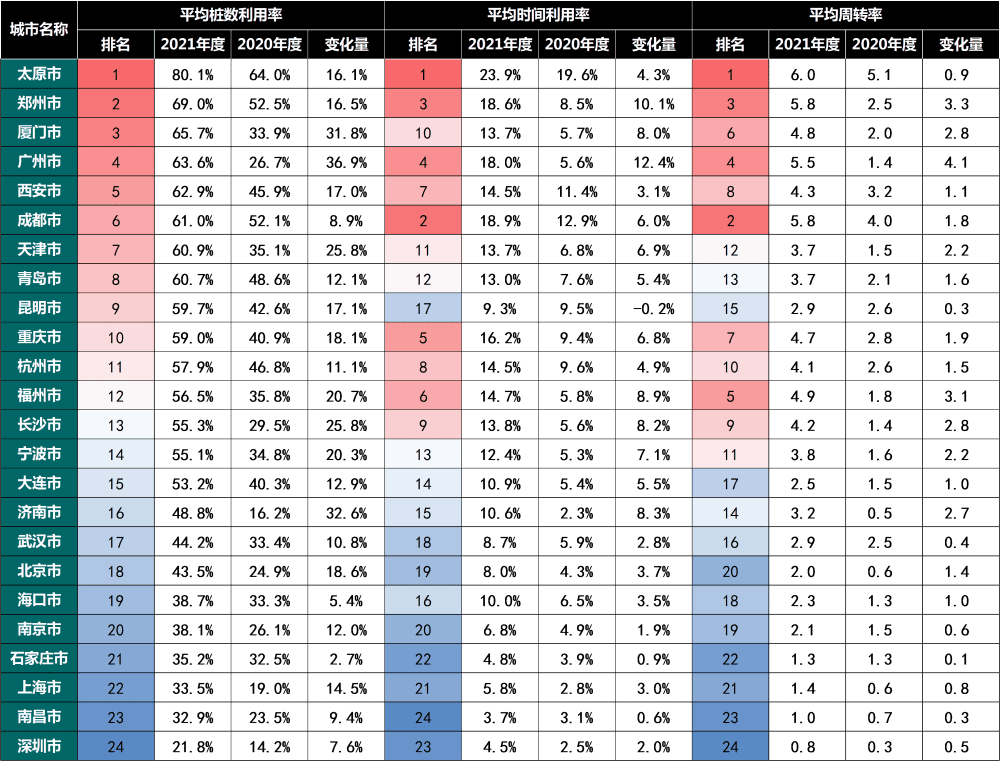 24座城市公用桩的平均桩数利用率、平均时间利用率、平均周转率在绝对值上分别提高16.9%、5.2%和1.6,相对增长率分别高达47.5%、75%和84%。厦门、广州、福州、长沙、济南等城市的公用桩效能提升幅度较大,海口、石家庄、南昌、深圳等城市的公用桩效能提升幅度较小。