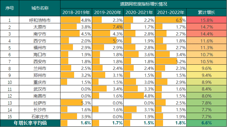呼和浩特、太原、南宁等城市持续较快速增长,西宁、福州、海口、西安等城市累计增长超过10%。从全国主要城市连续5年的道路网密度指标增长情况来看,累计增长幅度最大城市为呼和浩特,累计增长约15.8%,道路网密度指标从4.2km/km2提升至4.9km/km2。其次为太原市和南宁市,太原市累计增长约14.7%,道路网密度指标由5.2km/km2提升至6.0km/km2;南宁市累计增长约14.4%,道路网密度指标由6.6km/km2提升至7.6km/km2,增长了1.0km/km2。西宁、福州、海口、西安等城市也实现了道路网密度的持续提升。