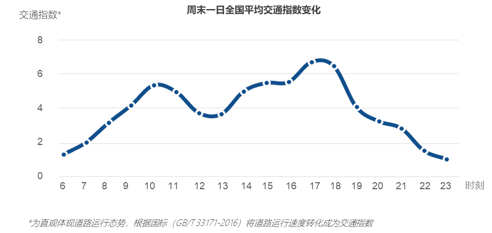 工作日,绝大部分城市单日交通运行状况呈现出明显早晚双波峰态势。其中94%的城市早高峰为8-9时,仅有拉萨、乌鲁木齐两个城市例外。75%的城市晚高峰为18-19时,除此之外,东北四市、山东半岛的济南和青岛、天津及宁波晚高峰为17-18时,乌鲁木齐晚高峰为20-21时。36个城市均呈现出晚高峰比早高峰更拥堵的现象。