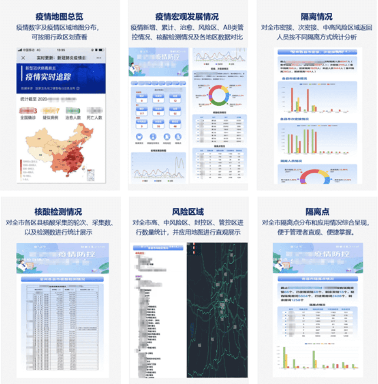 为满足防疫管理者多工作场景切换需求,世纪高通开发掌上疫情综合看板APP,补充移动端疫情信息宏观掌握手段,建设疫情地图总览、疫情宏观发展情况、隔离情况统计、核酸检测统计、风险地区统计以及隔离点分布六个部分。纵向从省市扩展到区县,全方位持续追踪疫情研判传播规律,持续提高常态化疫情防控水平。