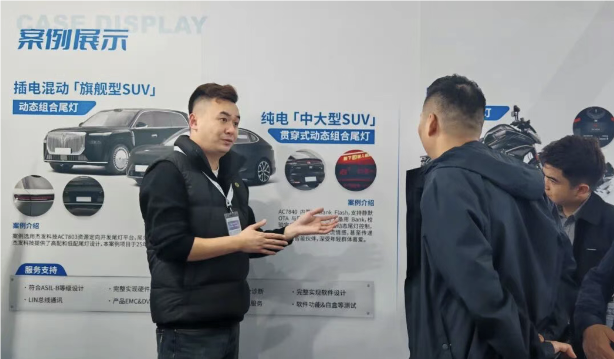 本次展会,杰发科技全面展示了贯穿式动态组合尾灯、动态组合尾灯、智能ADB前灯及智能氛围灯等客户案例量产方案,以及应用于以上车灯方案的芯片产品系列,为主机厂、Tier 1及车灯方案商提供了兼具高可靠性、灵活可扩展与极致性价比的规模化量产芯片底座。