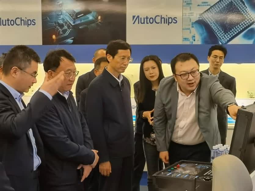 图:四维图新高级副总裁、杰发科技总经理梁永杰向考察团介绍杰发AC8015芯片